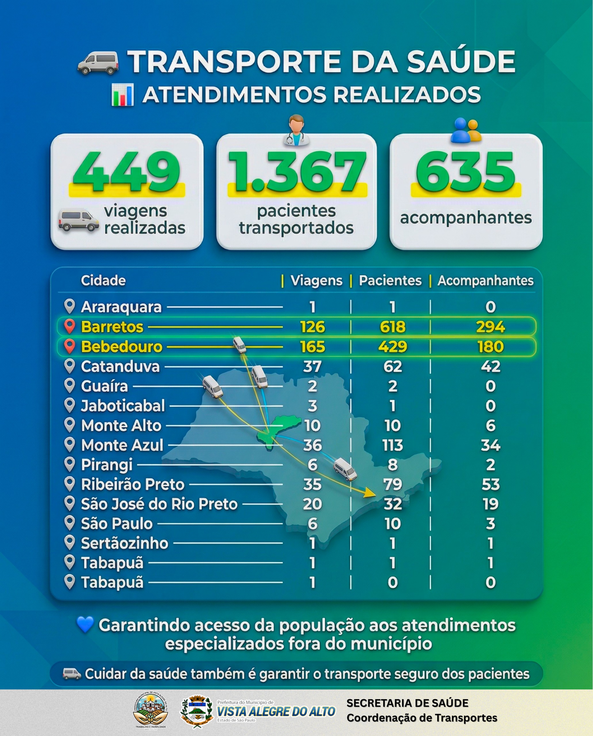 O Transporte da Saúde também desempenhou papel fundamental, com 449 viagens realizadas, garantindo o deslocamento de 1.367 pacientes e 635 acompanhantes para atendimentos em outras cidades.
