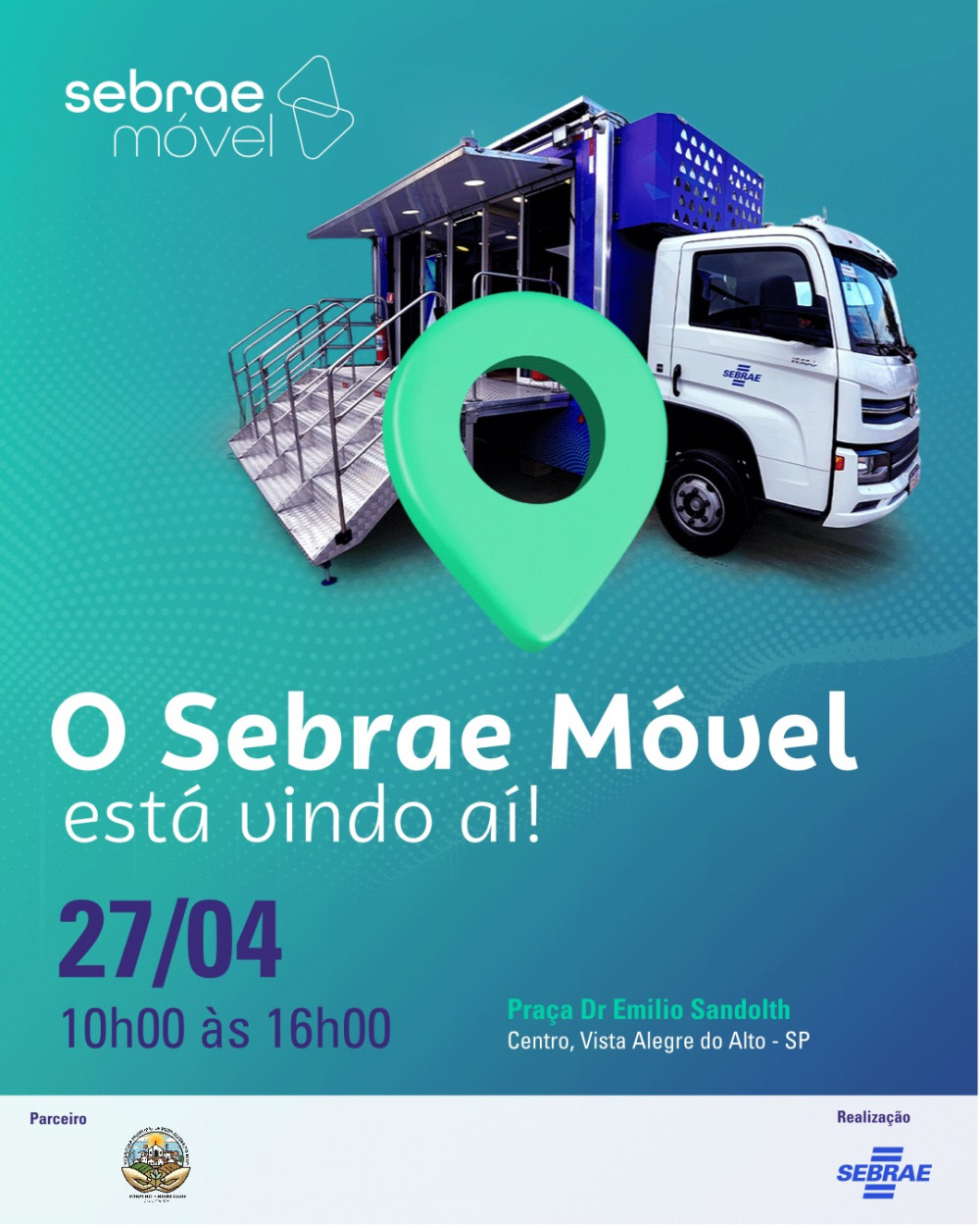 O Sebrae Móvel é um escritório itinerante que oferece atendimento gratuito e personalizado para quem deseja empreender ou já tem um pequeno negócio. Ele leva consultoria, auxílio na formalização (MEI), regularização e declaração (MEI), gestão financeira, marketing, vendas e acesso a crédito diretamente ao município de Vista Alegre do Alto. Não perca essa oportunidade!