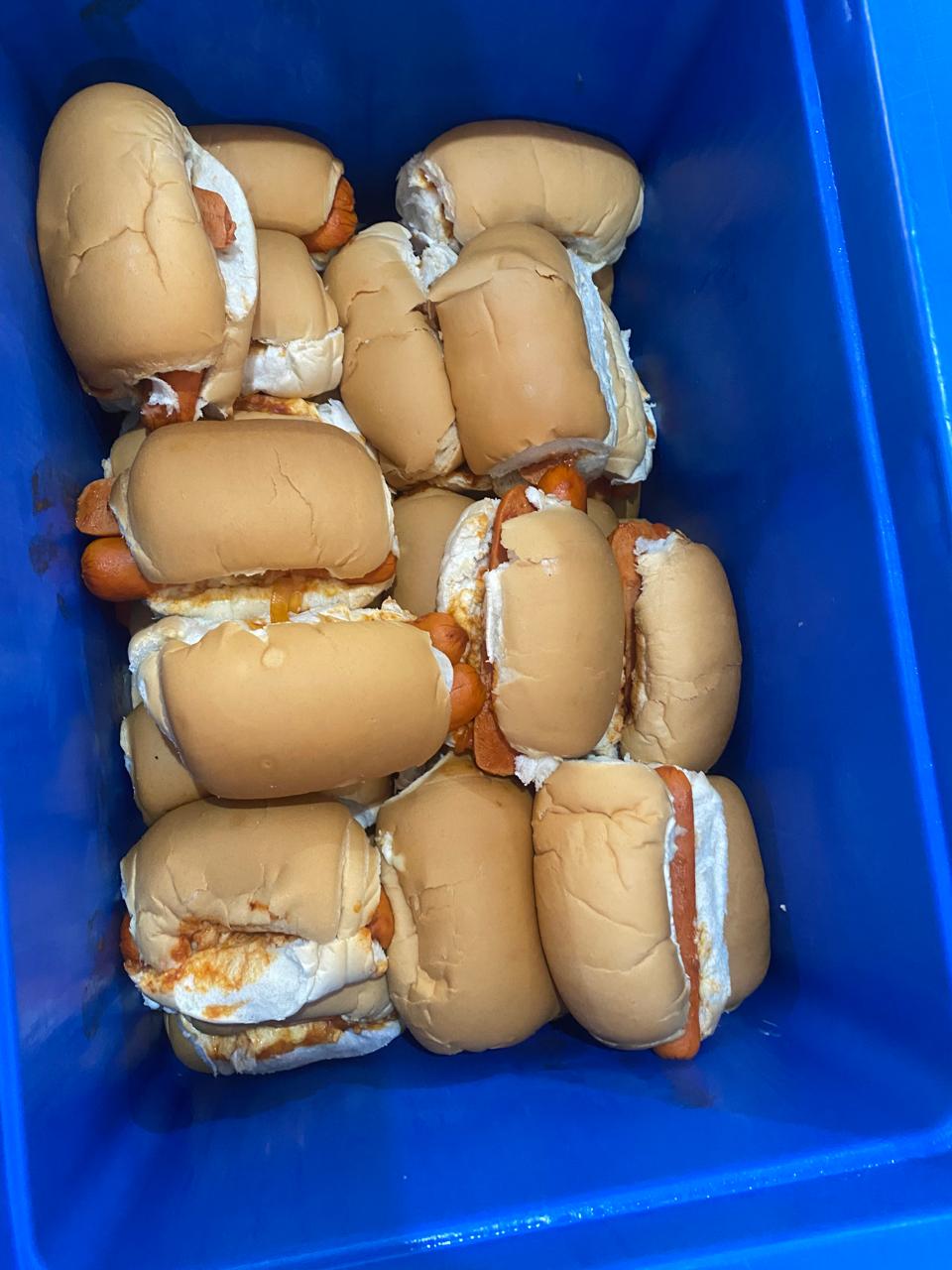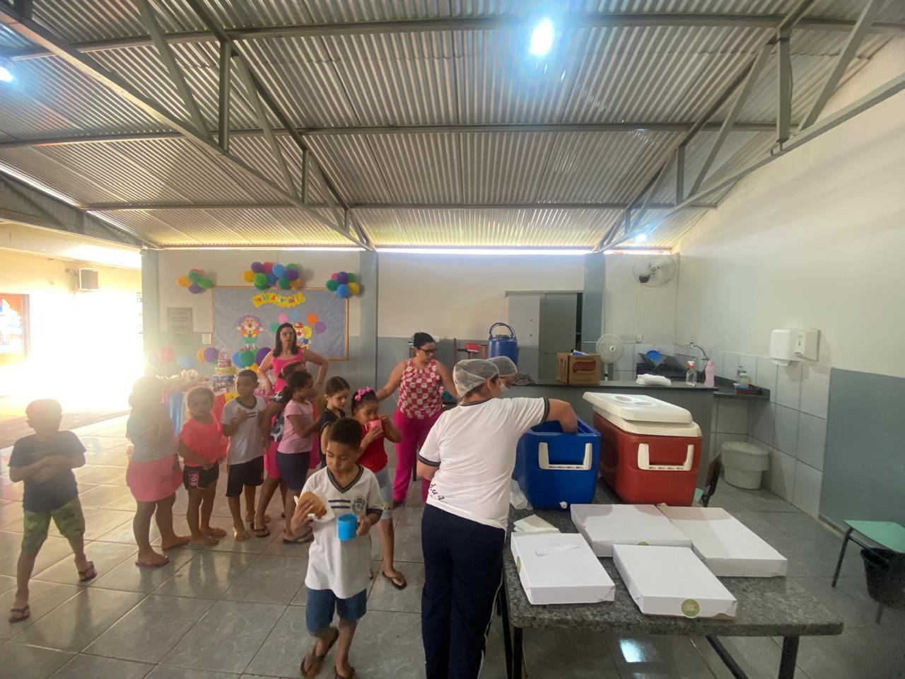 O cardápio do dia foi pensado especialmente para as crianças, com cachorro-quente, salgadinhos, bolo e suco natural de laranja, garantindo um momento saboroso e de confraternização.